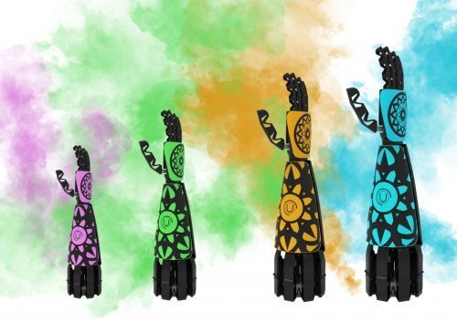 The prosthesis is equipped with interchangeable fairings that allow the child to give the prosthesis their own look. These fairings are attached to the prosthesis using a hook/magnet system and are therefore easy to replace or exchange. Thanks to the versatile possibilities of 3D printing, different colors and shapes can be applied to the fairings.