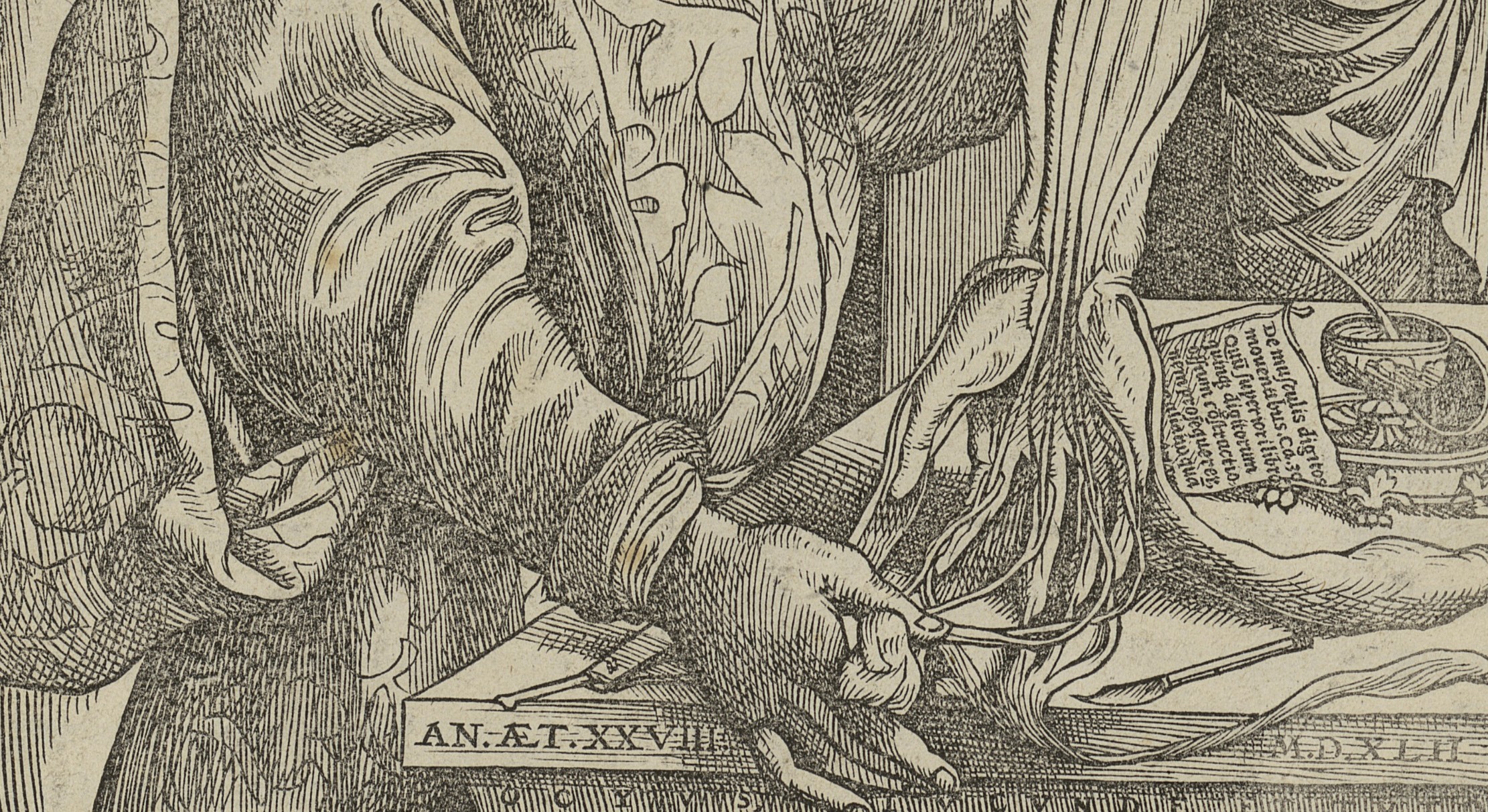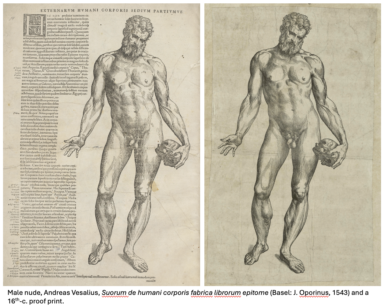 Figure. Male nude, Andreas Vesalius, Suorum de humani corporis fabrica librorum epitome (Basel: J. Oporinus, 1543) and a 16th-c. proof print.