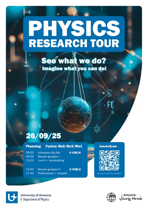 The Physics Research Tour on Friday, September 26, is intended to introduce you to the physics research conducted at our university and to help our researchers and you find a thesis topic. We will start the day with a parallel Ba/Ma session about the thesis program (administration, practical information, etc.). You will then be divided into groups and given the opportunity to visit different research groups. Lunch will be provided during the afternoon, and you will have time to travel from Campus Drie Eiken (CDE) to Campus Groenenborger (CGB). We will conclude the day with a poster session combined with a reception, giving you the opportunity to chat with the researchers at your leisure.