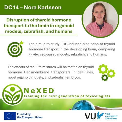 The main objective of this project is to determine the effects of EDC mixture exposure on thyroid hormone transport to the developing brain in novel human in vitro models and compare these effects to changes observed in cerebrospinal fluid thyroid hormone levels observed in humans and zebrafish. Selected real-life mixtures from the case studies will be tested for their effect on thyroid hormone transmembrane transporters (THTMTs) in dedicated THTMT-overexpressing cell lines as well as in human blood-cerebrospinal fluid barrier (BCSFB) organoid models and zebrafish embryos.