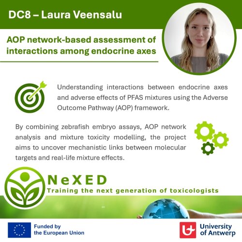 The main objective of this research project is to gain a better understanding of interactions/crosstalk between endocrine axes in complex environmentally realistic mixtures using AOP network-based approaches. A known historical PFAS polluted site will be used as a case study. Human-relevant adverse health effects of PFAS exposure will be selected based on human biomonitoring studies and corresponding endpoints will be investigated in zebrafish embryos exposed to singles and mixtures of PFAS to study the contribution of mixture components.