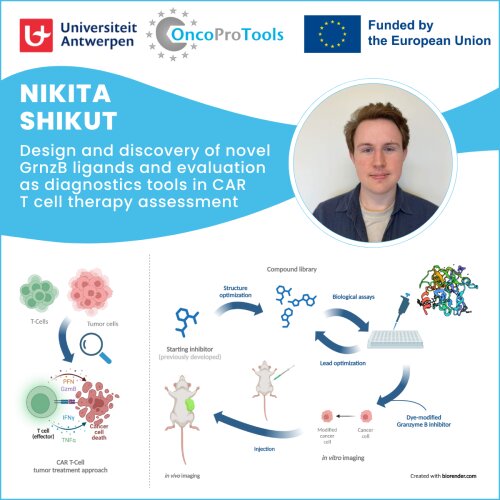 Hello, my name is Nikita Shikut, and I come from Moscow, Russia. I am a PhD-candidate for the DC1 position within the OncoProTools project. My bachelor’s and master’s degrees in organic chemistry were completed at Lomonosov Moscow State University. During that time, I found synthetic medicinal chemistry a very captivating field for me. As consequence, I pursued several internships at pharma companies and had a 3-months academic internship sponsored by the DAAD at Helmholtz Institute for Pharmaceutical Research Saarland (HIPS, Saarbrücken, Germany). As result, this positive experience helped me to pursue PhD study for my future perspective. As a PhD student at the University of Antwerp I will focus on developing and studying new small-molecules for inhibiting Granzyme B, a serine-protease involved in cell apoptosis within CAR T-cell approach.