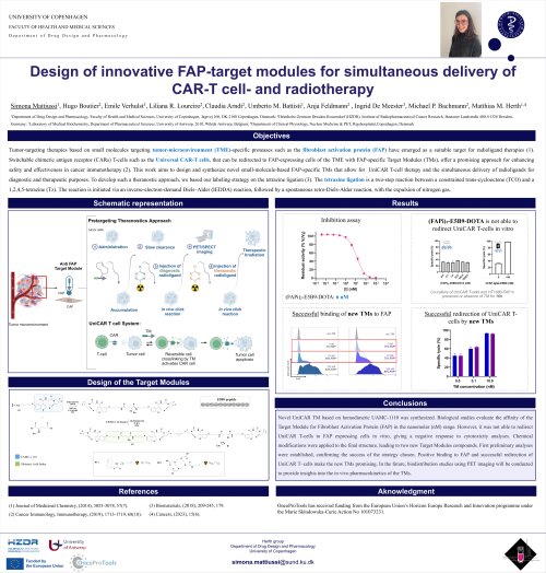 Simona Mattiussi, Hugo Boutier, Emile Verhulst, Liliana R. Loureiro, Claudia Arndt, Umberto M. Battisti, Anja Feldmann , Ingrid De Meester, Michael P. Bachmann, Matthias M. Herth. Design of innovative FAP-target modules for simultaneous delivery of CAR-T cell- and radiotherapy. 26th International Symposium on Radiopharmaceutical Sciences - iSRS 2025. 11-15 May 15, 2025.