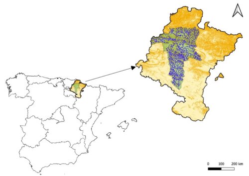 Figure 1. Chartered Community of Navarre’s location in Spain showing the Arga basin in green and the Arga River in blue.