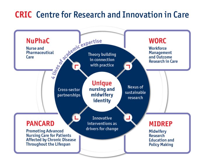 CRIC's activities encompass a diverse range of target groups and involve a variety of healthcare settings. Nurses and midwives play vital roles in the care for various patient populations and settings. While these settings may differ significantly, there are common overarching themes that define the care provided. CRIC actively facilitates the translation and transfer of knowledge, empirical insights, and best practices from one setting to another, fostering cross-pollination of expertise and experience. Throughout the years, in line with its’ unique mission and transversal domains, CRIC has established four specific lines of academic expertise (See Figure 1).