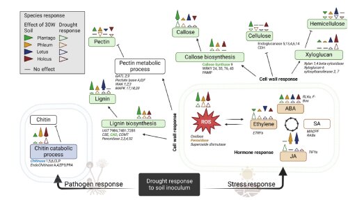 The persistent precipitation treatment altered soil fungal communities, which in turn influenced plant responses, with two out of four plant species showing clear stress-related adaptations. By integrating information on gene expression (“transcription”) with changes in plant form (“physiology”) and chemical composition (“biochemistry”), the study demonstrates that exposure to adapted soils activated common response mechanisms across the four grassland plant species. These mechanisms included internal signaling pathways and stress hormones, leading to tissue strengthening and enhanced resilience.