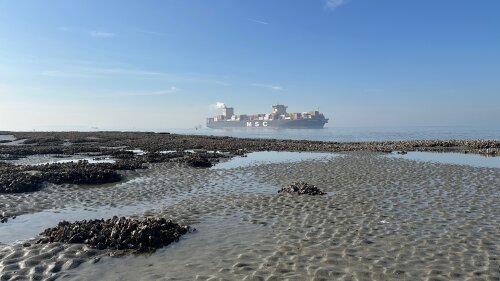 A container ship on the Western Scheldt passes exposed intertidal flats at low tide. These mudflats form the ecological core of the estuary, but are under pressure from past channel deepening and from ongoing dredging and sediment-disposal practices required to accommodate ever larger seagoing vessels.