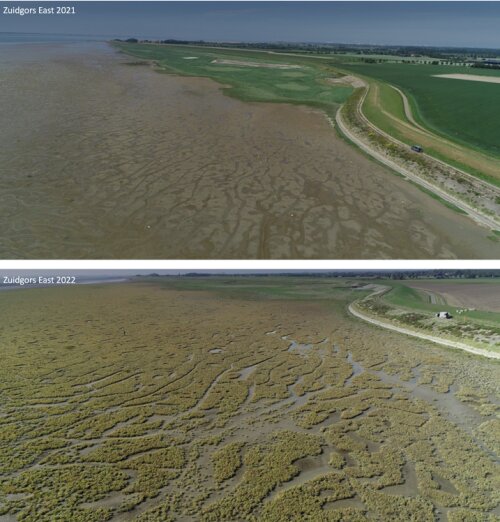 Development of Zuidgors between 2021 (top) and 2022 (bottom). Within a single year, a bare mudflat has largely developed into a vegetated salt marsh — a process that is becoming increasingly common. (Photo: Jeroen van Dalen)
