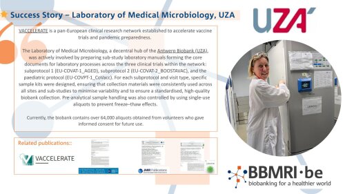 The Laboratory of Medical Microbiology is proud to be featured as a biobank success story within the European vaccine research initiative VACCELERATE. The story, published by BBMRI.be, highlights the key contribution of the LMM team to building and managing a high-quality biobank that supports large-scale vaccine research across Europe.