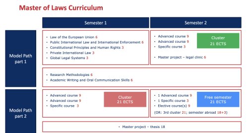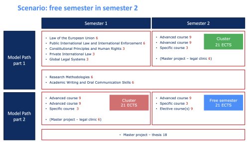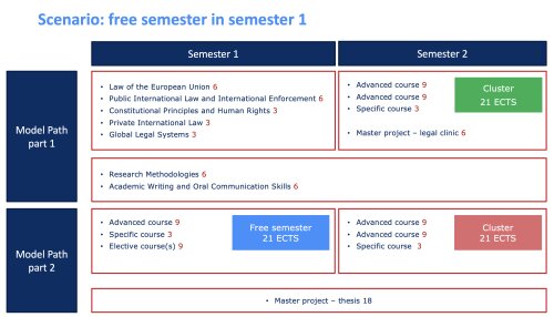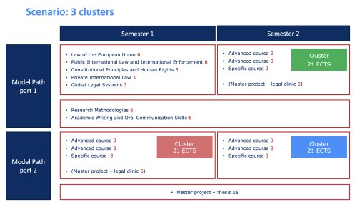 This LL.M. is problem-based and interdisciplinary, combining mandatory courses with thematic, case-based clusters and an open space. Over two years, students complete a Master's dissertation and legal clinic, and in the second year they may study abroad for one semester at a partner university. For further details, please select a theme from the overview on the left-hand side.