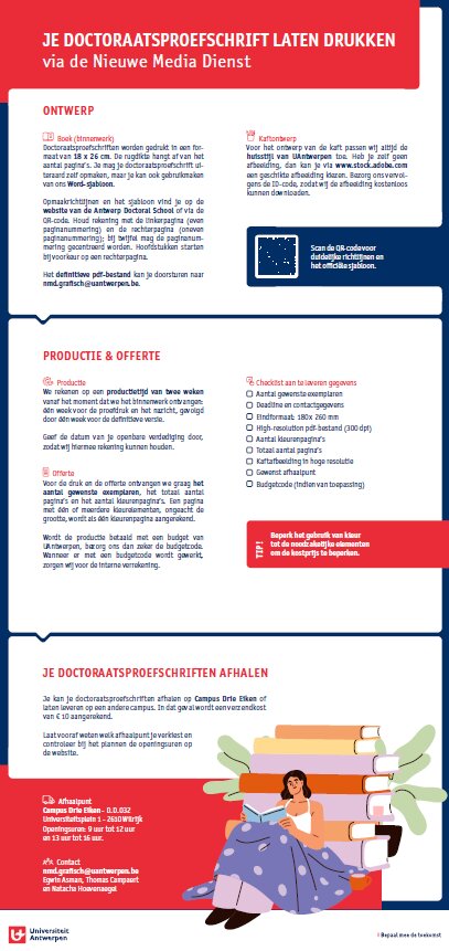 De folder 'Je doctoraatsproefschrift laten drukken via de Nieuwe Media Dienst' geeft een overzicht van welke stappen je dient te ondernemen om je doctoraatsproefschrift te laten drukken via de Nieuwe Media Dienst van de Universiteit Antwerpen.