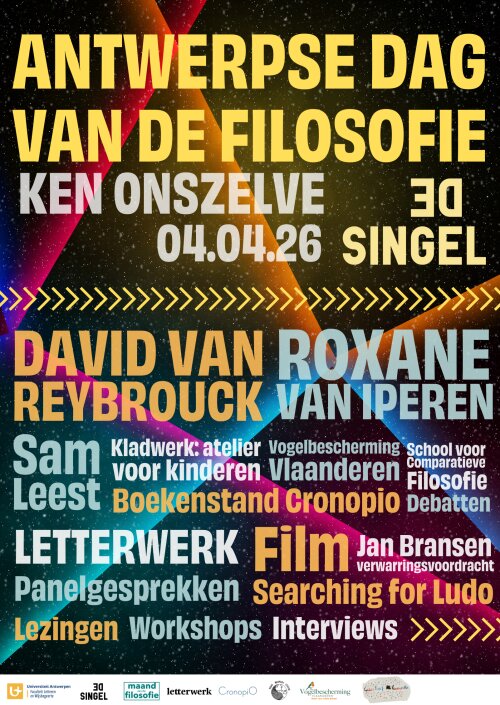 Welkom op de Antwerpse Dag van de Filosofie! Tijdens dit inspirerend eendaags festival nemen we je mee op een filosofische ontdekkingstocht aan de hand van lezingen, workshops, debatten en kunst. Zoals elk jaar sluiten we aan bij het thema van de Maand van de Filosofie, ‘Ken Onszelve’.