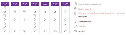 | Dag 0 | +/-Dag 1 (+20u tot +28u na visite 1) | +/- Dag 7 | +/- Dag 28 | +/-Dag 29 (+20u tot +28u na visite 4) | +/- Dag 35 | +/- Dag 56 | |