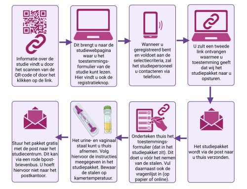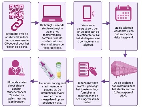 Studieverloop: 1 telefonisch contact & eenmalig staalafname (urine en vaginaal) vanuit huis of op locatie & 1 vragenlijst invullen