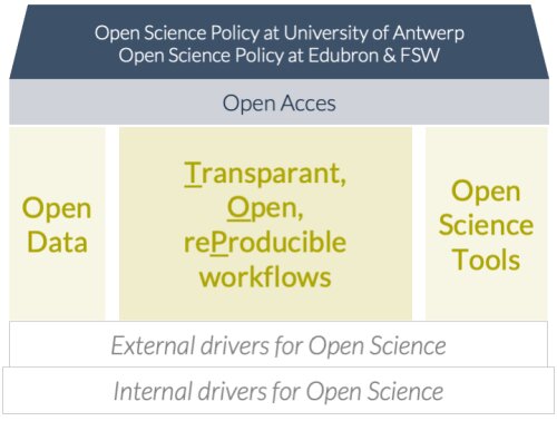 Externe én interne drijfveren voor Open Science vormen het fundament van het Open Huis. Open Science is steeds vaker een vereiste vanuit externe financiëringskanalen. We willen Open Science echter zodanig implementeren dat onderzoekers er ook de meerwaarde voor het eigen onderzoekswerk in (h)erkennen.
