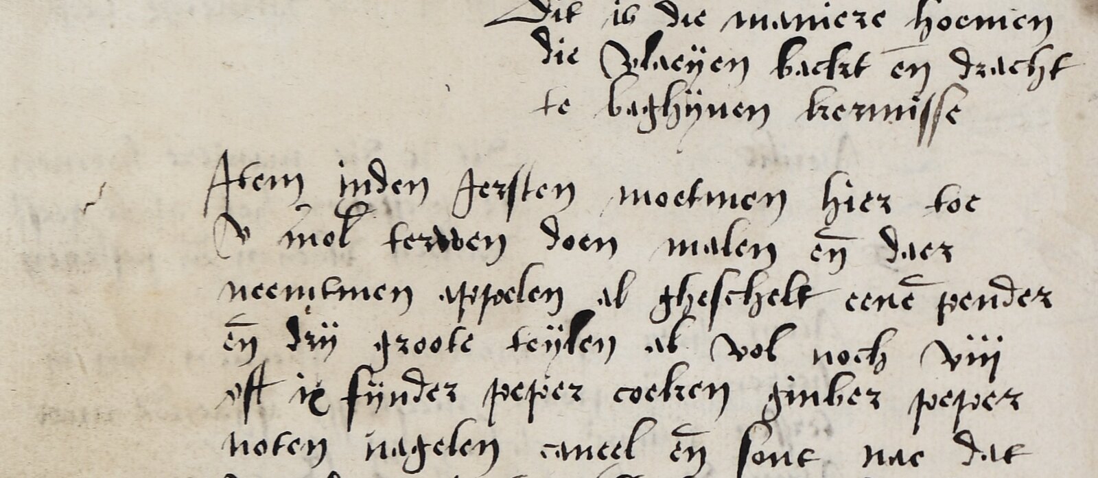 Wil je bijvoorbeeld het handschrift inkijken dat de basis vormde voor het kookboek Goddelijke gerechten? Dan vraag je in de bibliotheek het handschrift met de signatuur RG HS NEERL 150 aan. Dan krijg je "Notitieboek van het Begijnhof van Leuven" ter inzage.