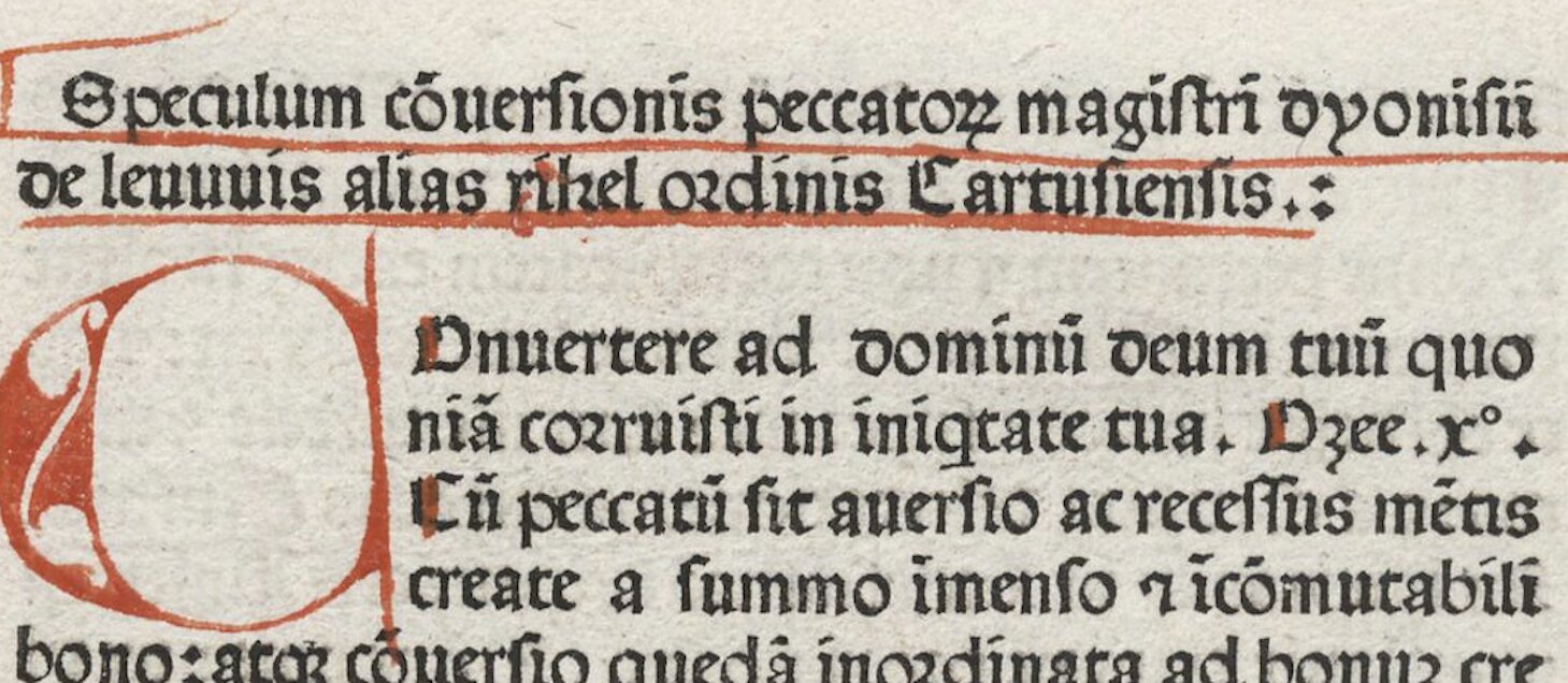 Een van de (vele) parels van het Ruusbroecgenootschap is ook door de Vlaamse Overheid als topstuk erkend. Het gaat om het werk Speculum Conversionis Peccatorum, of de Spiegel van de bekering der zondaars uit 1473. Dit is het allereerste boek dat in de Zuidelijke Nederlanden van de persen kwam: Dirk Martens drukte de Speculum in samenwerking met de Duitser Jan van Westfalen. Het werk is van de hand van de Limburgse kartuizer en veelschrijver Dionysius van Rijckel (1402/03-1471).