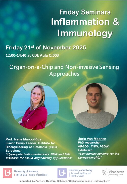 On Friday 21 November, Joris will delve deeper into this topic during the Friday Seminars ‘Inflammation & Immunology’ on the Campus Drie Eiken. In addition, Professor Irene Marco Rius from the Institute for Bioengineering of Catalonia (Barcelona) will give a lecture on her innovative MRI technique, which she applies to small-scale models such as OOC’s.