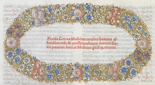 · Corona florida medicinae, sive De conservatione sanitatis van Antonius Gazius (1449 - 1528). Is een belangrijk traktaat over hygiëne en preventieve geneeskunde. Bevat een erratablad waarin de auteur zich kritisch uitlaat over de fouten van de drukkers. Gedrukt door Johannes en Gregorius de Gregoriis de Forlivio in 1491 in Venetië. Link naar de bibliotheekcatalogus: MAG-P 14.1082