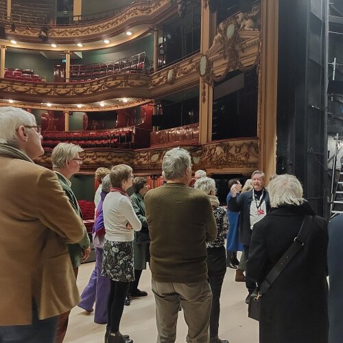 In een eerste bedrijf konden we, vijf hoog in het gebouw, kennismaken met de repetitieruimte voor de solisten, het koor en het orkest. In een tweede bedrijf loodste de gids ons door de grime- en kapruimte en het naaiatelier waar kleding wordt gemaakt, hersteld of aangepast. In het derde bedrijf van de rondleiding stonden we met zijn allen op de scène en werden we wegwijs gemaakt in de enorme technische machinerie en apparatuur. Het vierde bedrijf speelde zich op verdieping -1 af. We konden de orkestbak bekijken. Voor de uiteindelijke finale namen de aandachtige EFUA -leden plaats in de rode pluche zetels op de parterre, waar de gids ons nog wat meer bijbracht over dit operahuis. Een warm applaus voor hem op het einde was een terechte en fijne appreciatie.