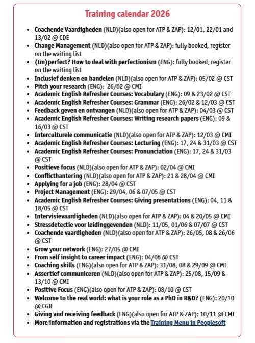 Hieronder vind je een overzicht van de opleidingen in 2025. Inschrijven voor de opleidingen kan via het Opleidingsmenu in PeopleSoft of via talentcenter@uantwerpen.be.
