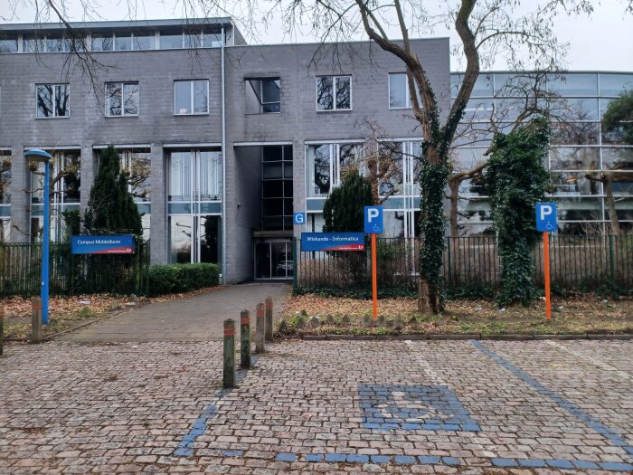 Er zijn 2 parkeerplaatsen voor personen met een handicap op deze parking. Ze bevinden zich naast de alternatieve ingang van gebouw G, (zie beeld).