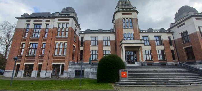 De hoofdingang van gebouw M.A. heeft een statige trap. Links onder die trap is de rolstoeltoegankelijke ingang van gebouw M.A. -