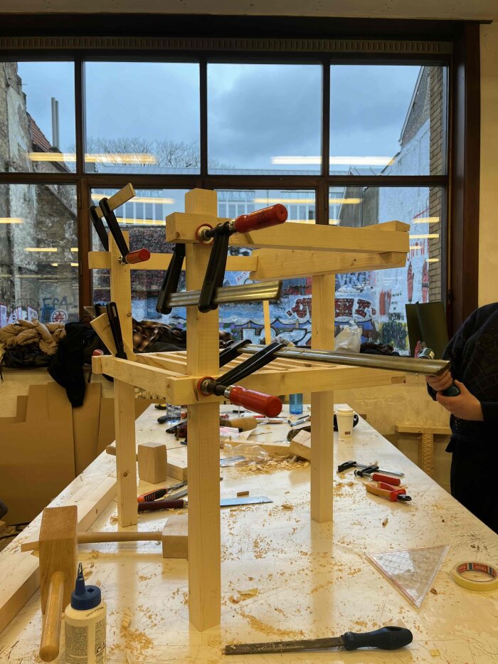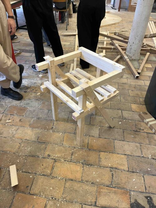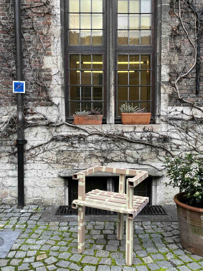 We kozen voor een flexibel design bij het ontwerpen van het zitmeubel. De gebruiker heeft zo de vrijheid om de stoel te verplaatsen en de eerder formele ruimte te activeren. De ritmiek die binnen de ruimte heerst zorgt voor een serene sfeer, we besloten de symmetrische verhoudingen van de ramen door te trekken in de stoel. We hopen met onze stoel een aangename zitgelegenheid te creëren waar men op vrienden kan wachten of gewoonweg op rust kan komen.