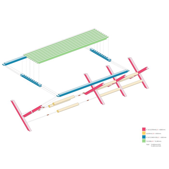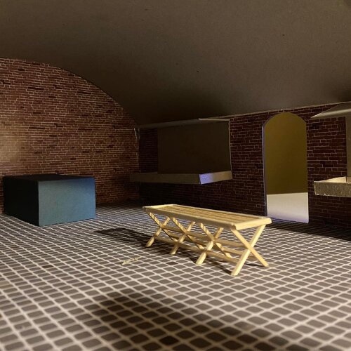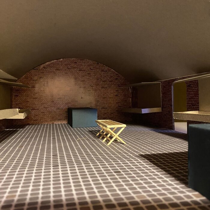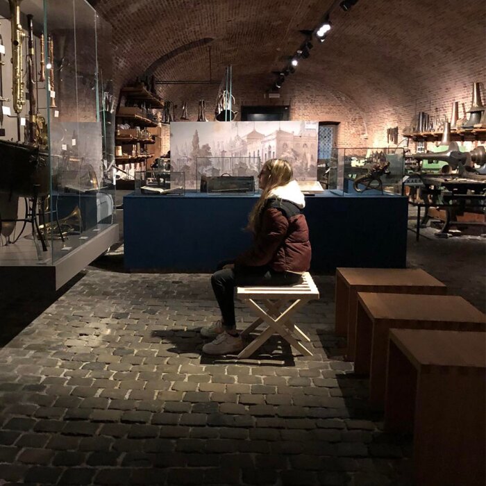 We willen bezoekers een rustmoment bieden en hen tegelijkertijd op een comfortabele manier de tentoongestelde collectie laten verkennen. Een muziekinstrument uit de collectie inspireerde ons om te werken met kruisverbindingen voor de dragende structuur.