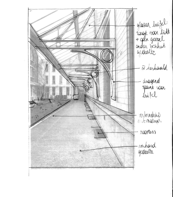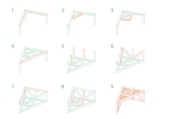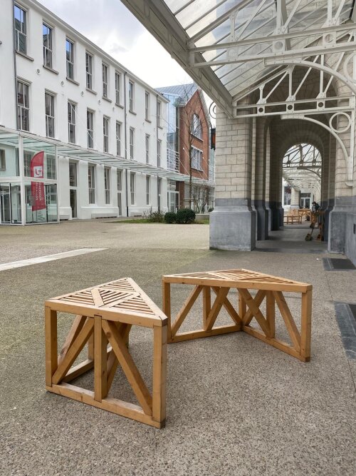 Het zitmeubel aan de Paardenmarkt is ontworpen vanuit een vormentaal die refereert naar de verbanden in de aanwezige luifel. Dankzij hun vorm kunnen de meubels flexibel tegen elkaar worden geschoven in verschillende opstellingen. De constructie bestaat uit enkel robuuste driehoeken, waarvan het zitvlak is afgewerkt met een oppervlak van fijnere elementen. Dit ontwerp versterkt de identiteit van de locatie en nodigt uit tot gebruik en interactie.