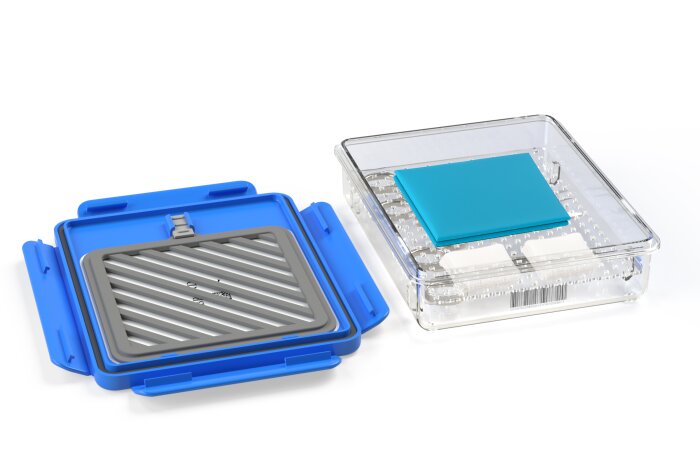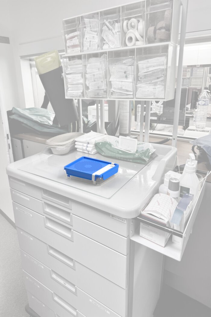 De instrumenten tray houdt vier metalen instrumenten op hun plaats met ingebouwde magneten. Hierdoor kunnen ze snel en efficiënt worden genomen en teruggeplaatst. Gegraveerde contouren geven duidelijk aan waar elk instrument thuishoort. Dit voorkomt verlies of onbedoeld weggooien van instrumenten en maakt het geheel overzichtelijk en gebruiksvriendelijk voor zorgverleners. Een geïntegreerde defect indicator laat toe om schade aan instrumenten of verpakking visueel te markeren, zodat defecten direct worden herkend en uitgesorteerd.