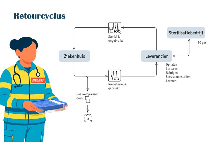 De verpakking bevat bovendien een ingebouwde, herbruikbare EO-gasfilter. Hierdoor kan de hele box, inclusief inhoud, veilig worden gesteriliseerd. Na gebruik worden de Revi-boxen door de leverancier opgehaald, gereinigd, geassembleerd en opnieuw gesteriliseerd. Zo komen de sets volledig gebruiksklaar terug op de spoed- of andere afdeling, zonder bijkomende druk op de interne sterilisatiedienst van het ziekenhuis.